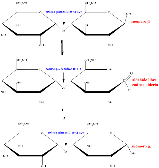 Observe que el anillo de glucosa a la derecha por tener un carbono hemiacetálico, también produce la forma de aldehído libre o cadena abierta.