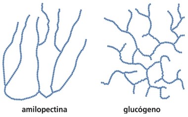 Las células vivas oxidan a la D-glucosa en el primero de una serie de procesos que les proporcionan energía. Cuando los animales tienen más D-glucosa que la que necesitan para producir su energía, convierten el exceso en un polímero llamado glucógeno. El glucógeno presenta una estructura parecida a la de la amilopectina, pero el glucógeno es más ramificado. Los puntos de ramificación en el glucógeno están a más o menos 10 residuos de distancia, mientras que los de la amilopectina surgen cada 25 residuos, aproximadamente. El alto grado de ramificación en el glucógeno tiene consecuencias fisiológicas importantes. Cuando un animal requiere energía, pueden eliminarse al mismo tiempo muchas unidades de glucosa de los extremos de muchas ramificaciones. Las plantas convierten el exceso de D-glucosa en almidón.