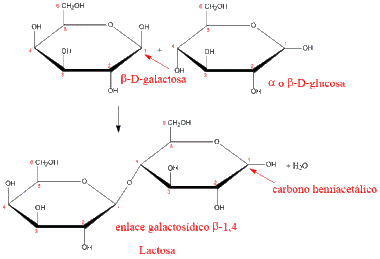 La lactosa, el azúcar de la leche, es un disacárido que se encuentra en la leche y en los productos lácteos. Constituye el 6-8% de la leche humana y aproximadamente el 4,5% de la leche de vaca y se utiliza en los productos que tratan de imitar la leche materna. Algunas personas no producen en cantidad suficiente la enzima necesaria para hidrolizar la lactosa, por lo que no digieren el azúcar y padecen dolores abdominales y diarrea. En algunos productos lácteos comerciales se añade una enzima denominada lactasa para romper la lactosa. El enlace en la lactosa es β-1,4-glicosídico, ya que la forma β de la galactosa forma un enlace con el grupo hidroxilo del carbono 4 de la glucosa. El grupo hidroxilo del carbono 1 de la glucosa proporciona las formas α- y β- de la lactosa. Debido a que la cadena abierta tiene un grupo aldehido que puede oxidarse, la lactosa es un azúcar reductor.