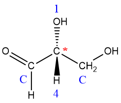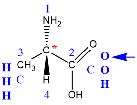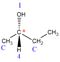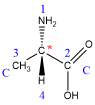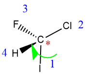 - Asigne la prioridad (alta = 1 a baja = 4) a cada grupo unido al centro de quiralidad según el número atómico. Ejemplo: H– < C– < N– < O– < Cl–