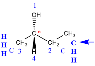 - En cada centro, enumere los 3 nuevos átomos unidos a medida que se aleja del centro de quiralidad (vea el segundo ejemplo que se muestra a continuación).