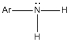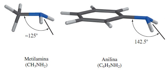 Arilaminas: La anilina, al igual que las alquilaminas, tiene un arreglo piramidal de enlaces en torno al nitrógeno, pero esa pirámide es algo más plana. Una medida del grado de esta planaridad se observa en el ángulo entre el enlace carbono-nitrógeno y la bisectriz del ángulo H — N — H.