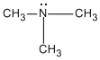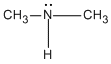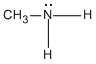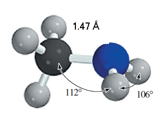 Alquilaminas: Como se muestra en la siguiente figura, la metilamina, al igual que el amoniaco, tiene un arreglo piramidal de los enlaces con el nitrógeno. Sus ángulos H - N - H (106°) son un poco menores que el valor tetraédrico de 109.5°, mientras que el ángulo C — N — H (112°) es un poco mayor. La distancia del enlace C — N, 1.47 Å, está entre las distancias características de C — C en los alcanos (1.53 Å) y las del enlace C — O en los alcoholes (1.43 Å).