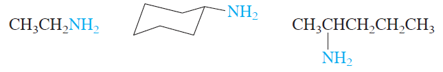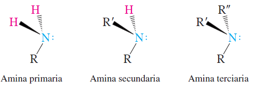 A diferencia de los alcoholes y los halogenuros de alquilo, que se clasiican como primarios, secundarios o terciarios de acuerdo con el grado de sustitución del carbono que lleva el grupo funcional, las aminas se clasifican de acuerdo con su grado de sustitución en el nitrógeno. Una amina con un carbono unido al nitrógeno es una amina primaria; una amina con dos carbonos es una amina secundaria y una amina con tres es una amina terciaria.
