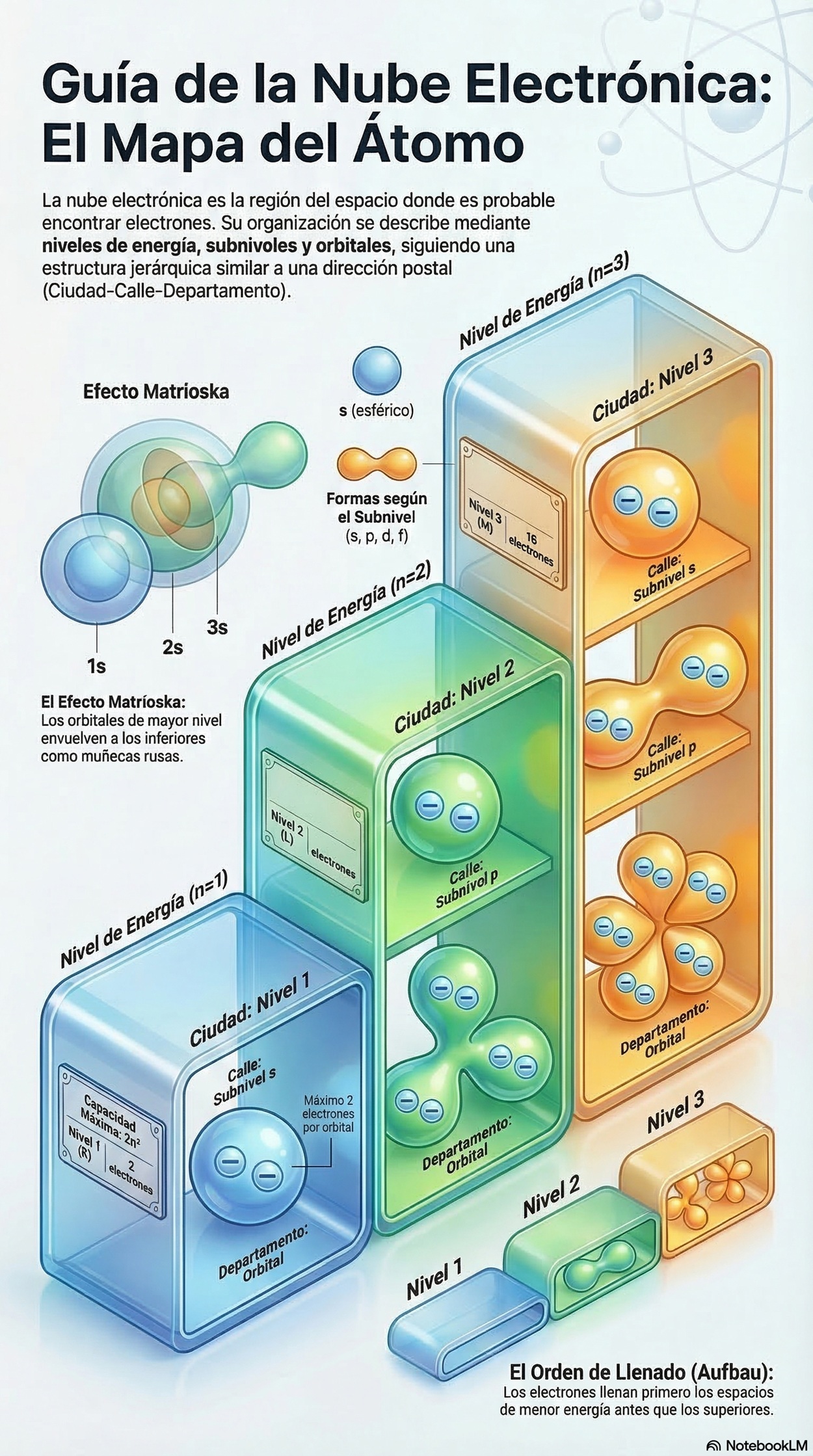 Una vez que comprendemos la "topografía" del átomo con sus niveles (ciudades), subniveles (calles) y orbitales (departamentos), podemos analizar cómo se van ocupando de verdad.