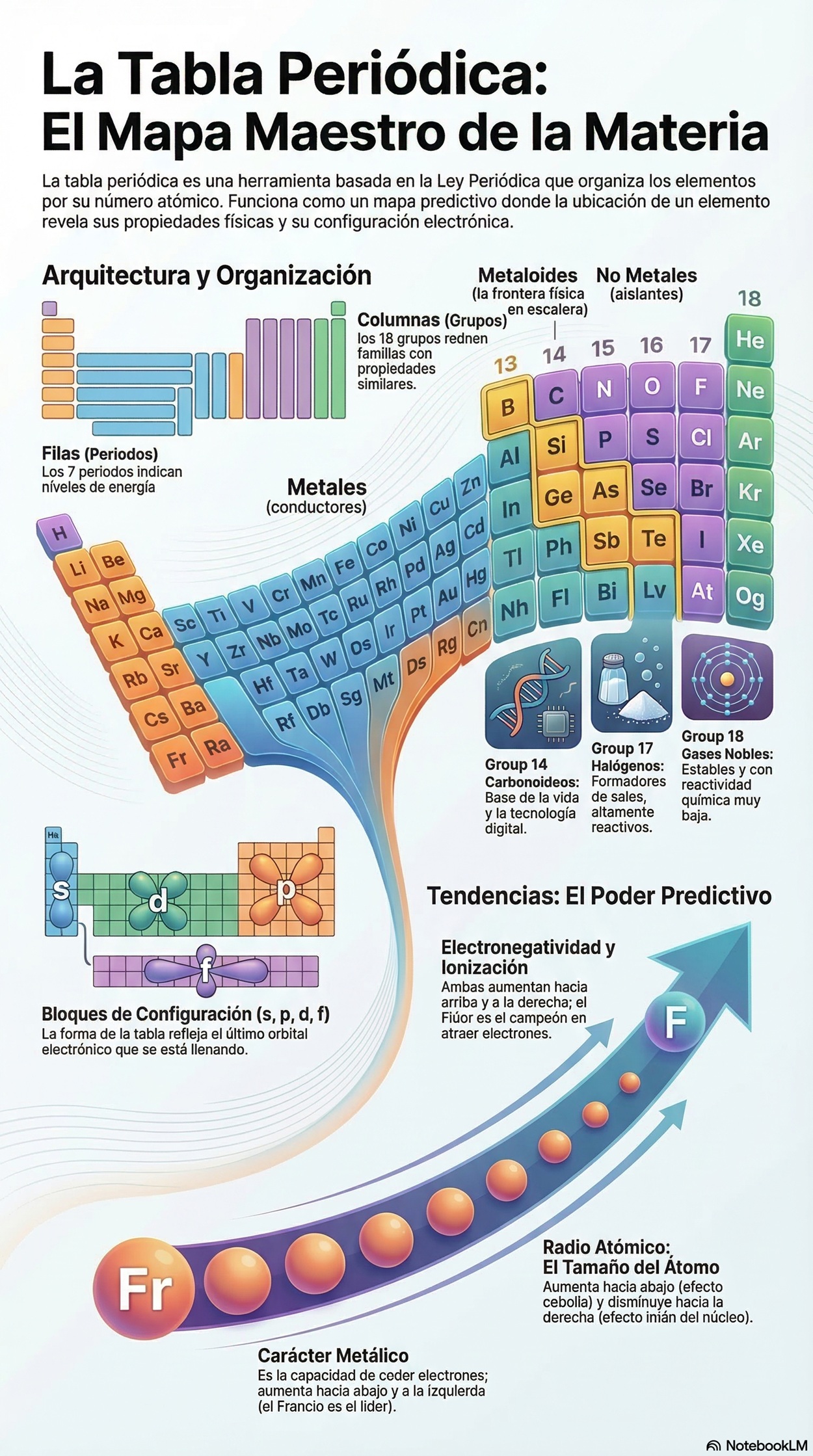 El Superpoder Predictivo: Explica por qué la Tabla Periódica es considerada el mapa maestro de la química. ¿Cómo puedes deducir la reactividad, el tamaño y la electronegatividad de un elemento (como el Francio o el Oxígeno) basándote únicamente en sus "coordenadas" geográficas (Grupo y Período)?